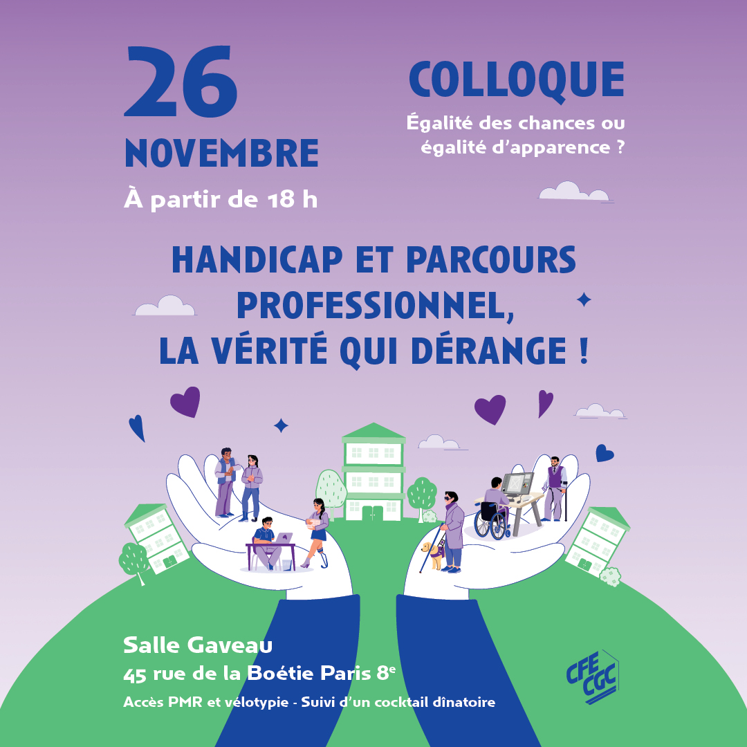 La CFE-CGC et l'union départementale de Paris organisent un colloque sur le thème « Égalité des chances ou égalité d’apparence ? – Handicap et parcours professionnel, la vérité qui dérange ! » le 26 novembre à partir de 18 heures, salle Gaveau (Paris).