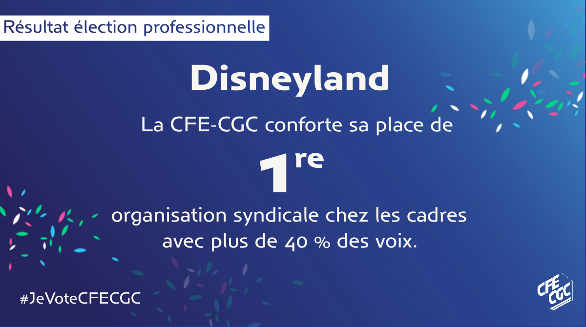 La CFE-CGC Disneyland conforte sa place de première organisation syndicale chez les cadres avec plus de 40 % de voix et une progression de 10 points.