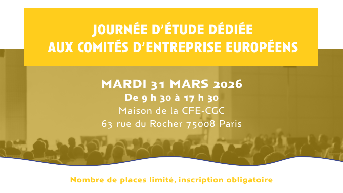 Vous êtes membre ou futur membre d’un Comité d’entreprise européen (CEE) ? La CFE-CGC a le plaisir de vous inviter à participer à une journée d’étude dédiée aux Comités d’entreprise européens le 31 mars 2026 de 9H30 à 17H30 à la Maison de la CFE-CGC, 63 rue du Rocher à Paris.