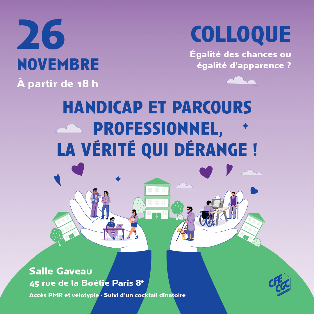 La CFE-CGC et l'union départementale de Paris organisent un colloque sur le thème « Égalité des chances ou égalité d’apparence ? – Handicap et parcours professionnel, la vérité qui dérange ! » le 26 novembre à partir de 18 heures, salle Gaveau (Paris).