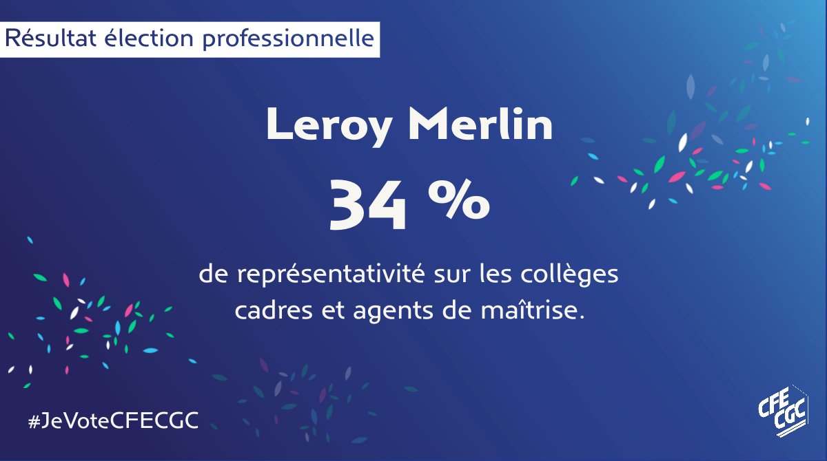 Lors des élections professionnelles chez Leroy Merlin, la CFE-CGC obtient 34 % de représentativité sur les collèges cadres et agents de maîtrise.