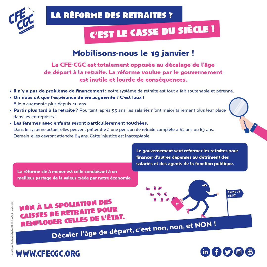 La CFE-CGC rappelle son opposition au report progressif de l'âge légal de départ à la retraite. Dans un tract, elle conteste les arguments financiers et politiques du gouvernement.