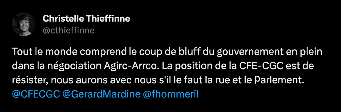« Aujourd’hui, avec la situation financière favorable de l’Agirc-Arrco et l’impact de la réforme des retraites, le mécanisme n’a plus lieu d’être, expliquait au début de la négociation Christelle Thieffinne, secrétaire nationale CFE-CGC à la protection sociale et cheffe de file durant la négociation. Si ce malus perdurait, ce serait une double peine pour les salariés qui subissent déjà un décalage de 62 à 64 ans de l’âge légal de départ à la retraite. »