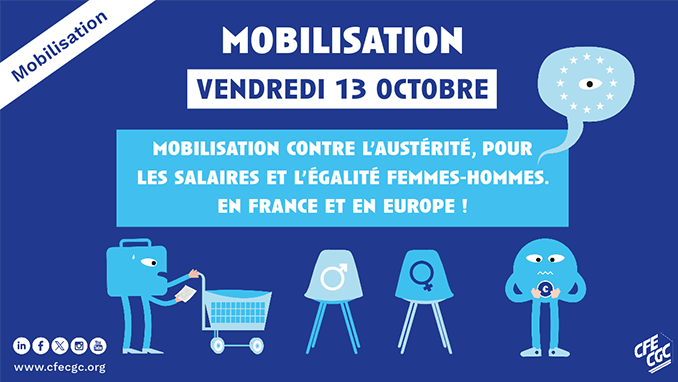 L’intersyndicale (CFE-CGC, CFDT, CFTC, CGT, FO, UNSA, Solidaires, FSU) appelle à une mobilisation massive le 13 octobre contre l’austérité, pour l’augmentation des salaires et l’égalité femmes-hommes.